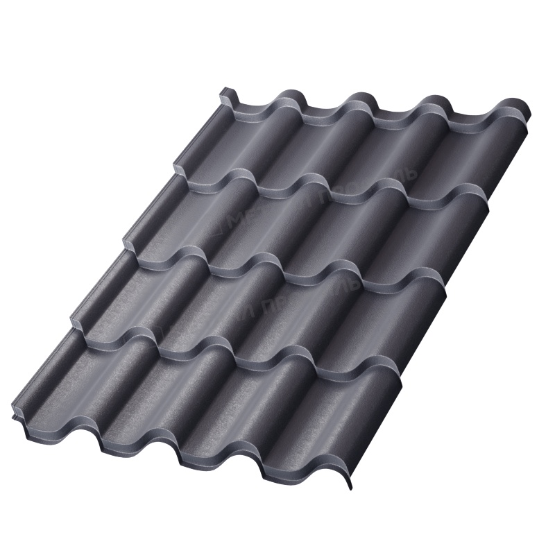 Профиль Монтерроса-X характеризуется выразительной волной, имитирующей натуральную черепицу с увеличенной высотой ступеньки. Высота профиля достигает 25 мм, что придает крыше объемный и рельефный вид. Толщина металла 0,5 мм гарантирует баланс между легкостью монтажа и структурной прочностью. Такой дизайн не только эстетичен, но и функционален: он улучшает водоотвод и снижает нагрузку от снега. В сером графитовом исполнении профиль выглядит современно и лаконично, подходя для зданий в стиле минимализм или хай-тек.